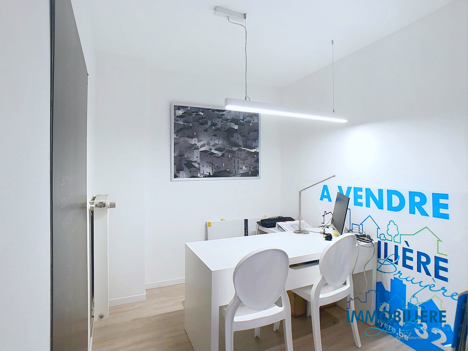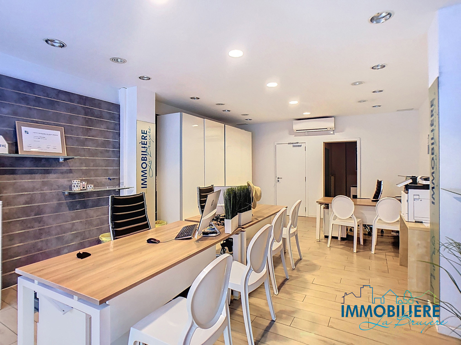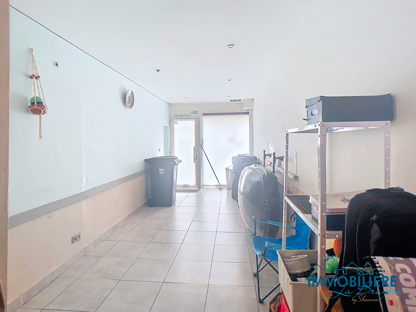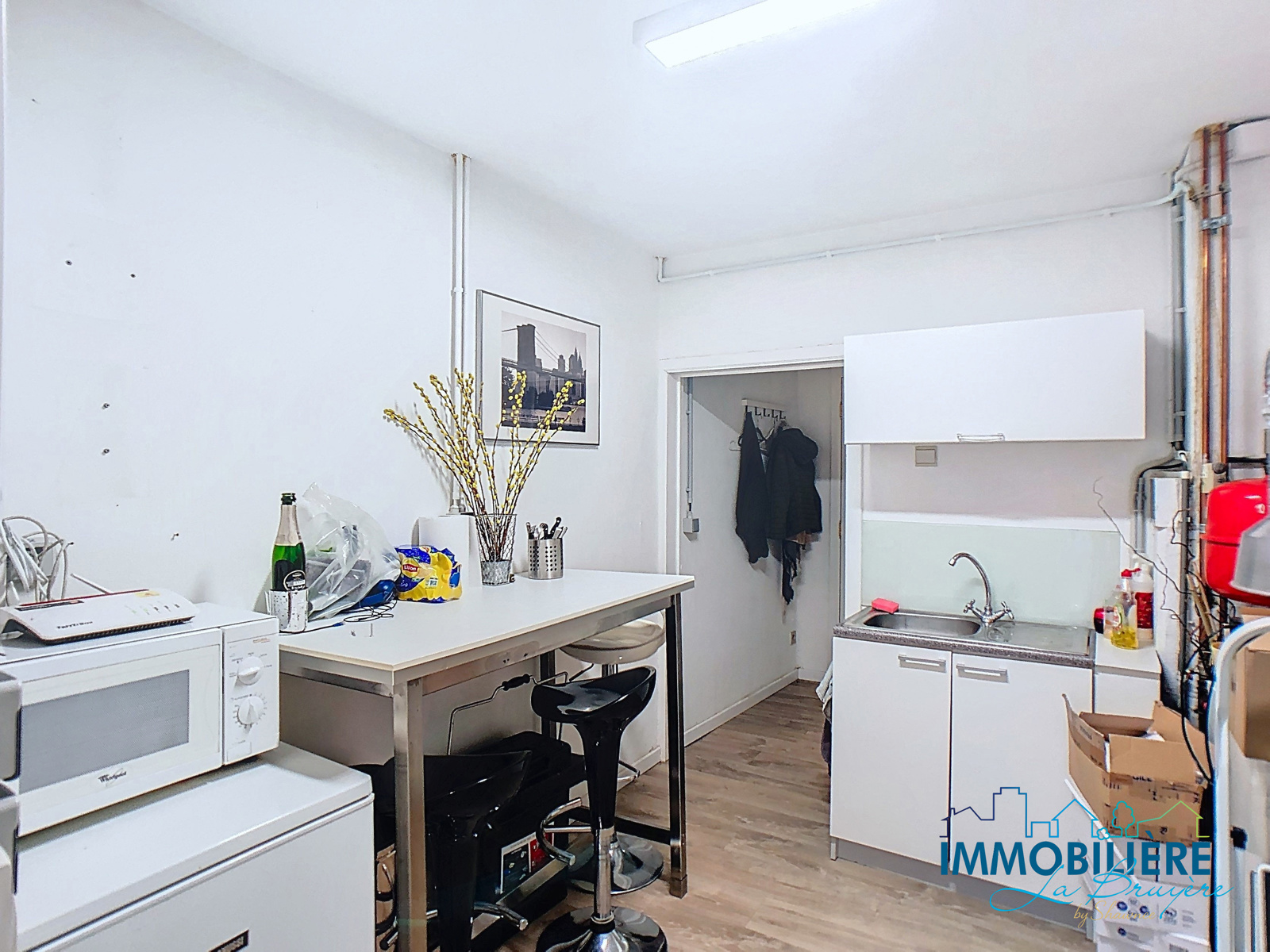 Commerce 1 : pièce avant avec grande vitrine (4,7m x 8,5m), bureau (2,2m x 2,9m), cuisine/rangement (2,4m x 3m) et une toilette individuelle (+/- 2m²)
